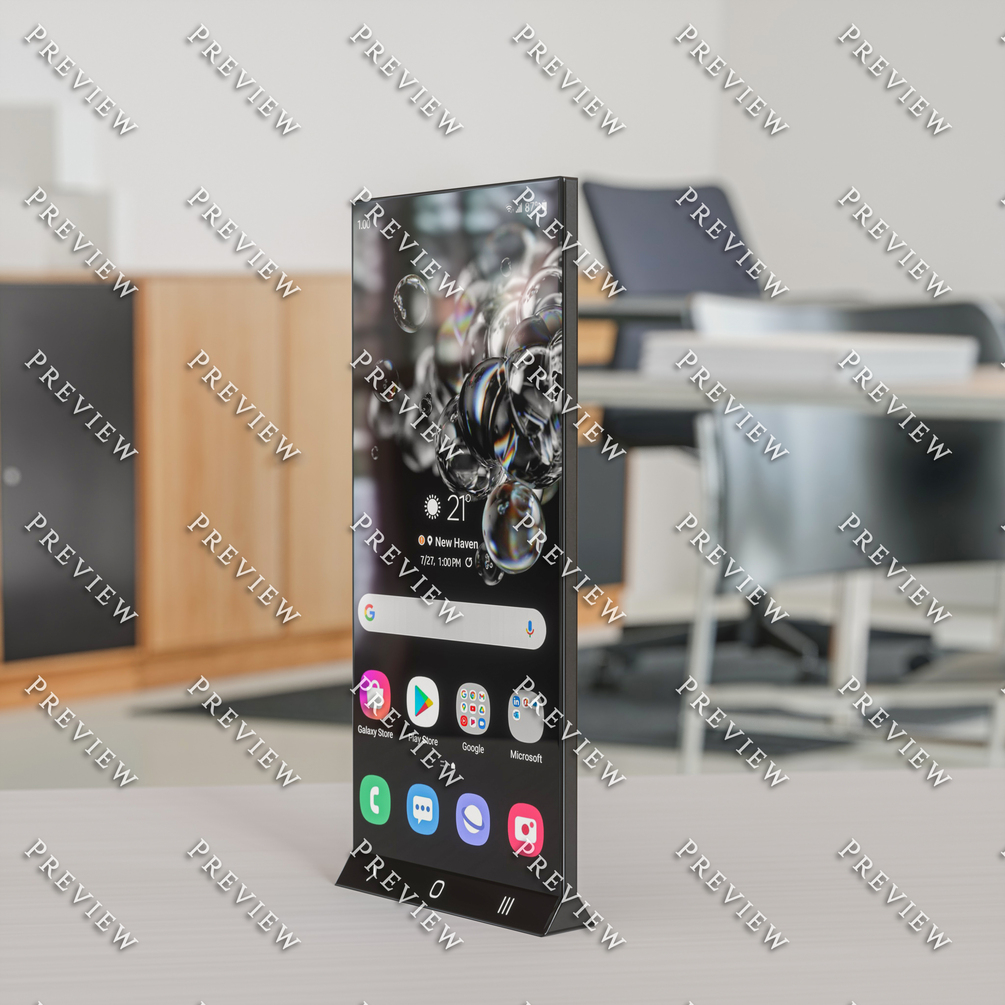 Rendering design of an innovative self-standing mobile phone with a triangular base - For Personal Use Only