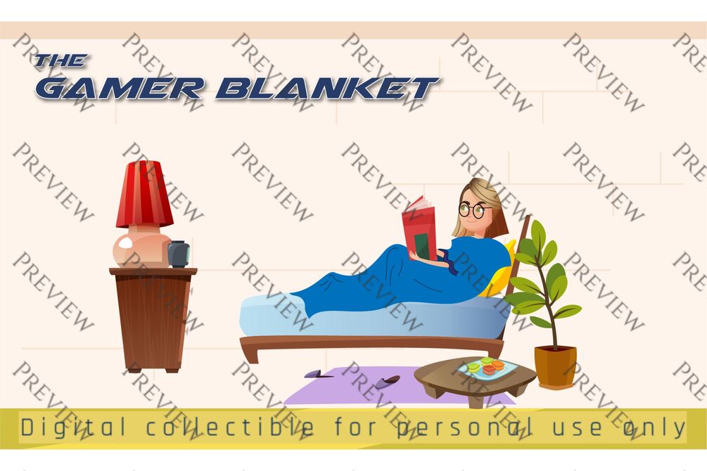 A rendering of the Gamer Blanket in use. The scene displays a person handling a book through the arm openings all while staying covered with the Gamer Blanket. For Personal Use Only
