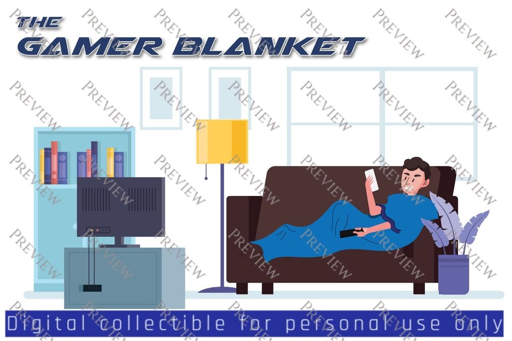 A rendering of the Gamer Blanket in use. The scene displays a person handling the remote and a smartphone through the arm openings all while staying covered with the Gamer Blanket. For Personal Use Only